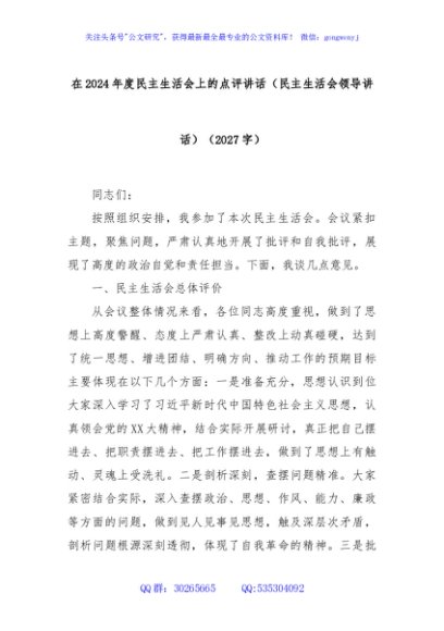 / 在2024年度民主生活会上的点评讲话(民主生活会领导讲话)(2027字)