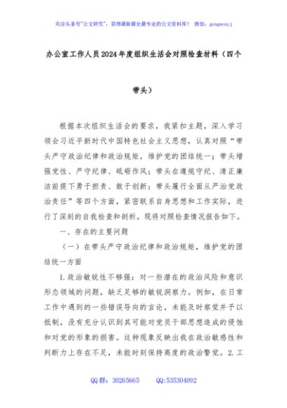 / 办公室工作人员2024年度组织生活会对照检查材料(四个带头)