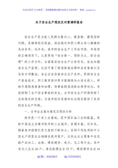/ 关于安全生产现状及对策调研报告
