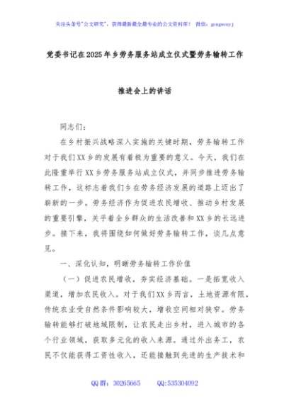 / 党委书记在2025年乡劳务服务站成立仪式暨劳务输转工作推进会上的讲话