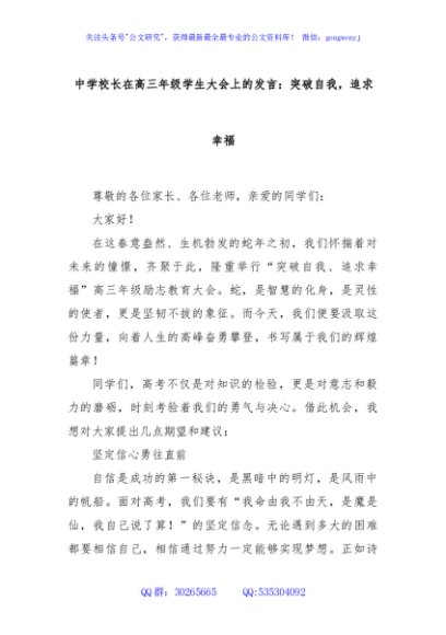 / 中学校长在高三年级学生大会上的发言:突破自我,追求幸福