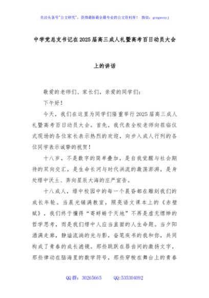 / 中学党总支书记在2025届高三成人礼暨高考百日动员大会上的讲话