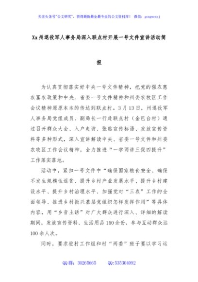 / Xx州退役军人事务局深入联点村开展一号文件宣讲活动简报