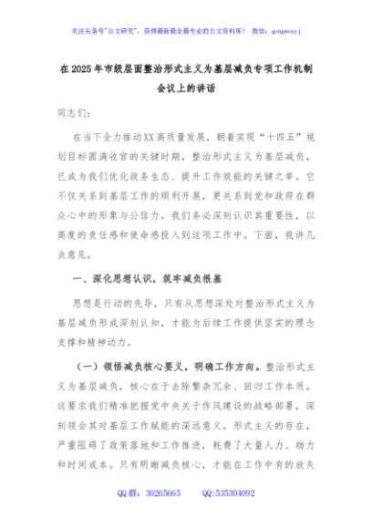 / 在2025年市级层面整治形式主义为基层减负专项工作机制会议上的讲话