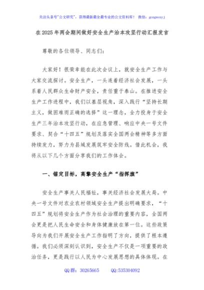 / 在2025年两会期间做好安全生产治本攻坚行动汇报发言