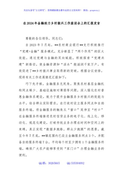 / 在2024年金融助力乡村振兴工作座谈会上的汇报发言