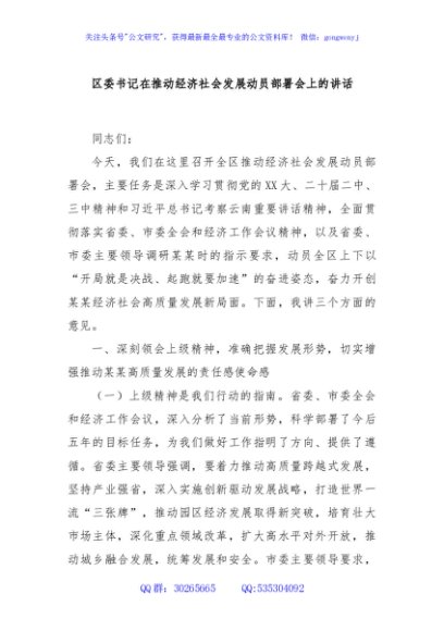 / 区委书记在推动经济社会发展动员部署会上的讲话