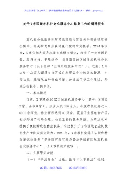/ 关于X市区域农机社会化服务中心培育工作的调研报告