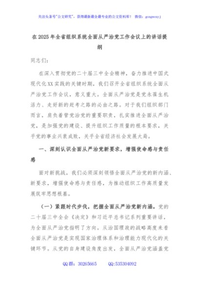 / 在2025年全省组织系统全面从严治党工作会议上的讲话提纲