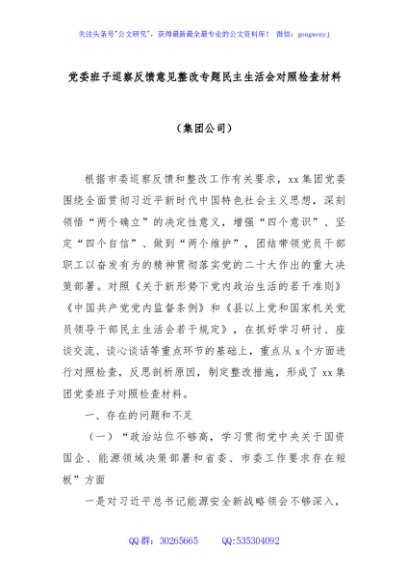/ 党委班子巡察反馈意见整改专题民主生活会对照检查材料(集团公司)