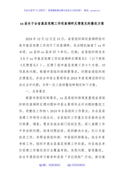 / xx县关于全省基层党建工作巡查调研反馈意见的整改方案