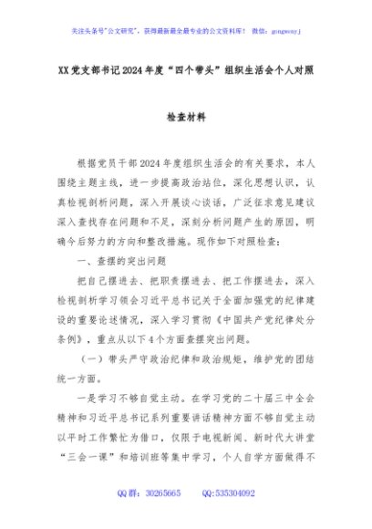 / XX党支部书记2024年度“四个带头”组织生活会个人对照检查材料