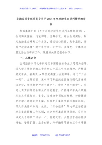 / 金融公司支部委员会关于2024年度政治生态研判情况的报告