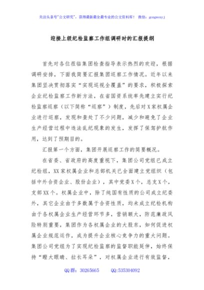 / 迎接上级纪检监察工作组调研时的汇报提纲
