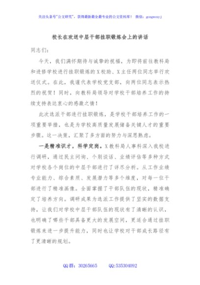 / 校长在欢送中层干部挂职锻炼会上的讲话