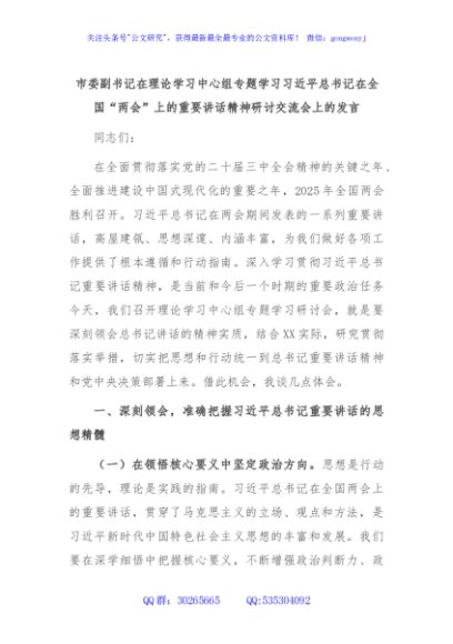 / 市委副书记在理论学习中心组专题学习习近平总书记在全国“两会”上的重要讲话精神研讨交流会上的发言