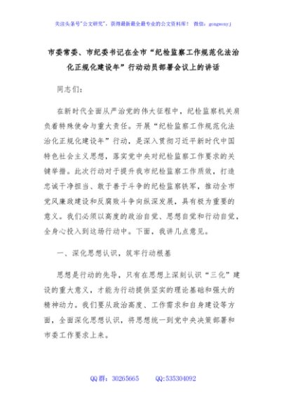 / 市委常委、市纪委书记在全市“纪检监察工作规范化法治化正规化建设年”行动动员部署会议上的讲话