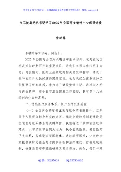 / 市卫健局党组书记学习2025年全国两会精神中心组研讨发言材料