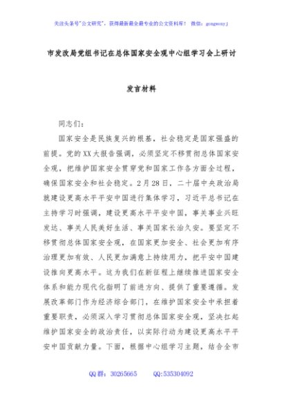 / 市发改局党组书记在总体国家安全观中心组学习会上研讨发言材料