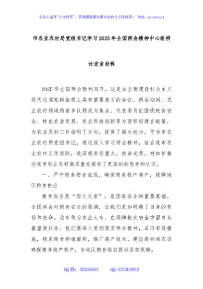 / 市农业农村局党组书记学习2025年全国两会精神中心组研讨发言材料