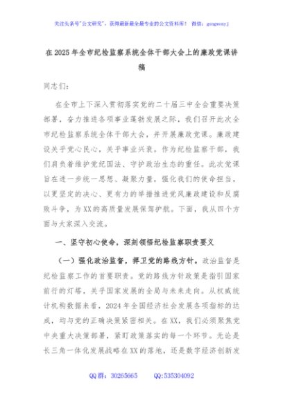 / 在2025年全市纪检监察系统全体干部大会上的廉政党课讲稿