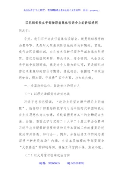 / 区组织部长在干部任职前集体谈话会上的讲话提纲