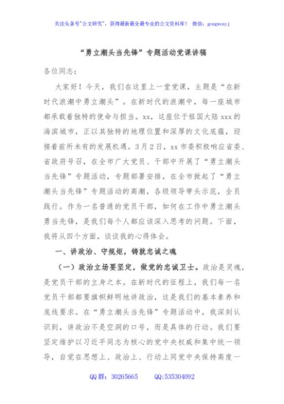 / “勇立潮头当先锋”专题活动党课讲稿