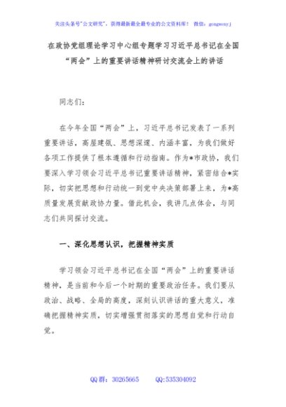 / 在政协党组理论学习中心组专题学习习近平总书记在全国“两会”上的重要讲话精神研讨交流会上的讲话
