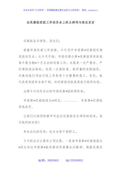 / 在巡察组进驻工作动员会上的主持词与表态发言