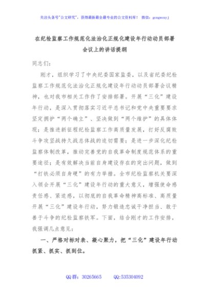 / 在纪检监察工作规范化法治化正规化建设年行动动员部署会议上的讲话提纲