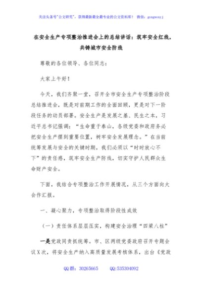 / 在安全生产专项整治推进会上的总结讲话:筑牢安全红线,共铸城市安全防线