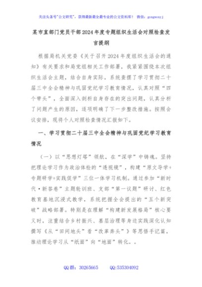 / 某市直部门党员干部2024年度专题组织生活会对照检查发言提纲
