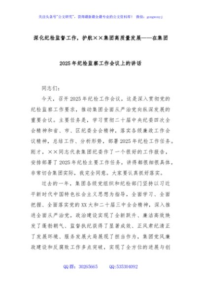 / 深化纪检监督工作,护航××集团高质量发展——在集团2025年纪检监察工作会议上的讲话