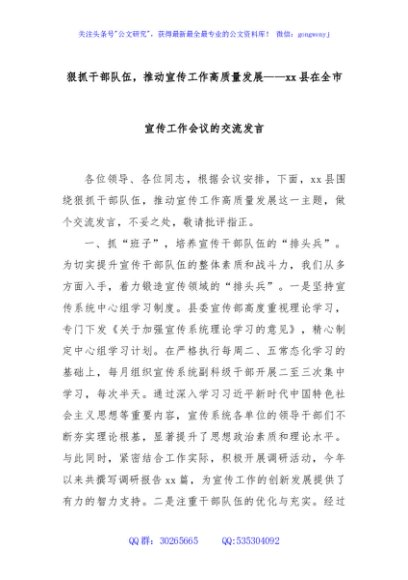 / 狠抓干部队伍,推动宣传工作高质量发展——xx县在全市宣传工作会议的交流发言
