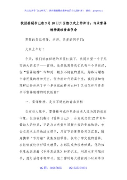 / 校团委副书记在3月10日升国旗仪式上的讲话:传承雷锋精神赓续青春使命