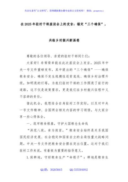 / 在2025年驻村干部座谈会上的发言:锚定“三个确保”,共绘乡村振兴新画卷