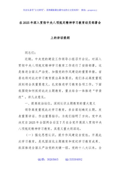 / 在2025年深入贯彻中央八项规定精神学习教育动员部署会上的讲话提纲