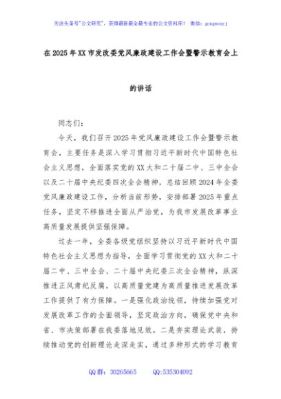 / 在2025年XX市发改委党风廉政建设工作会暨警示教育会上的讲话