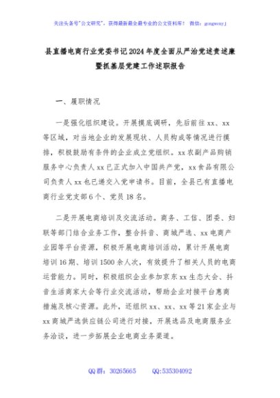 / 县直播电商行业党委书记2024年度全面从严治党述责述廉暨抓基层党建工作述职报告