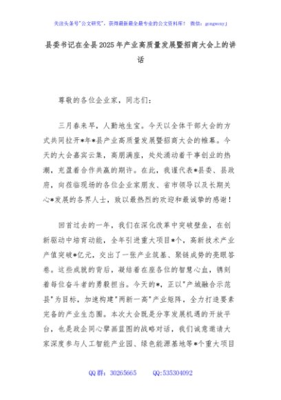 / 县委书记在全县2025年产业高质量发展暨招商大会上的讲话