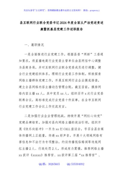 / 县互联网行业联合党委书记2024年度全面从严治党述责述廉暨抓基层党建工作述职报告