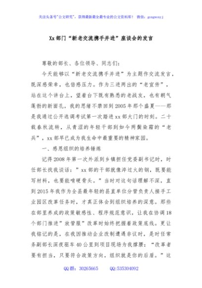 Xx部门“新老交流携手并进”座谈会的发言