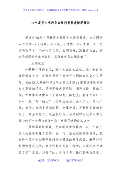 / 上年度民主生活会查摆问题整改情况报告