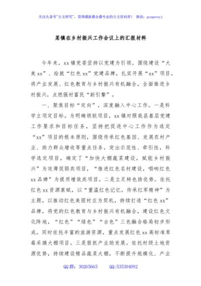 / 某镇在乡村振兴工作会议上的汇报材料
