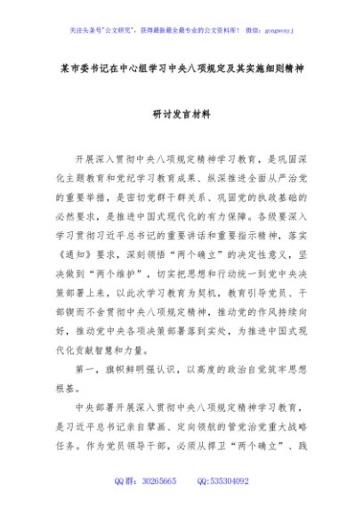 / 某市委书记在中心组学习中央八项规定及其实施细则精神研讨发言材料