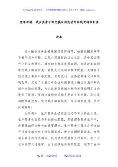 / 党课讲稿:城乡要素平等交换双向流动的实践逻辑和配套改革