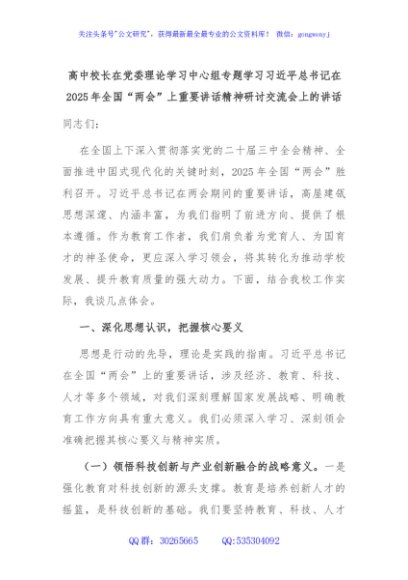 / 高中校长在党委理论学习中心组专题学习习近平总书记在2025年全国“两会”上重要讲话精神研讨交流会上的讲话