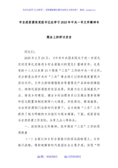 / 市自然资源局党组书记在学习2025年中央一号文件精神专题会上的研讨发言