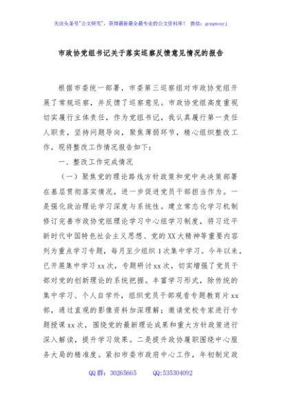 / 市政协党组书记关于落实巡察反馈意见情况的报告