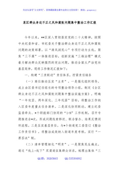 / 某区群众身边不正之风和腐败问题集中整治工作汇报